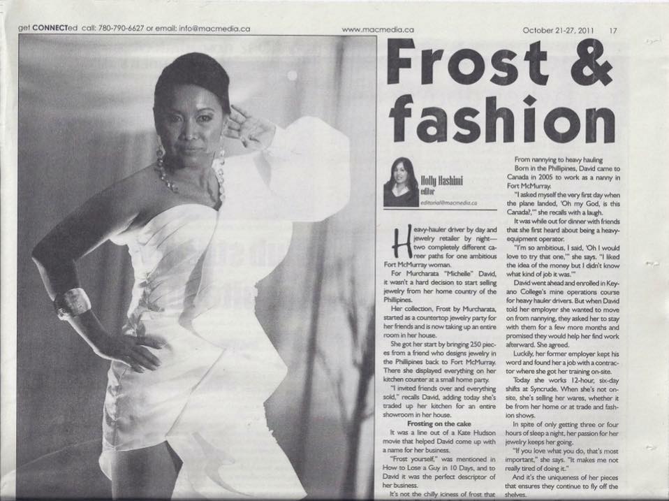 I worked 6 and 6, ang ibig sabihin niyan ay papasok ako ng 3 days and 3 nights at daysoff ko ng 6 na araw. Dito bumilib ang mga banyaga dahil bukod sa batak ako sa pag o operate ng mga giant trucks ng 12 hours per shift at overtime on top of that nagawa ko pang mag open ng iba't Ibang maliit na negosyo na tugma sa personalidad ko , Fashion ! Ako ay kilala sa lugar ng Fort McMurray, Alberta Canada na fashionista , the FROST Lady na sinamahan ko pa ng pagpapatayo ng isang wedding business kung Saan ako ang gumagawa palagi ng wedding show/ fashion show. Dahil sa angking sipag at Lalo akong nagsilbing inspiration sa kapwa Filipinos at mga banyaga, lagi akong naiimbitahan sa ibat ibang parte ng Canada ( Miss Earth Canada , Canada World Wide Pageant and pati pang batang pageant kinukuha rin ako ) and bansang Pilipinas ( National Pageant at pati sa local pageant natin na ilang beses ko na ring dinaluhan like Miss Tarlac ng ilang beses at Ginoong Tarlaqueño at napakarami pa ). Marami rin akong nari received na messages sa mga taong Hindi ko kilala at kilala ko na nagpapasalamat sa akin sa nakita ilang sipag, tapang, pagbibigay ng magandang halimbawa sa kapwa natin na ang pag asenso ay nandiyan lamang basta masipag ka, may pananampalataya sa Diyos, wala kang tinatapakang tao. Isipin mo palagi ang kinabukasan ng mga mahal mo sa buhay. Ang pag a abroad ay Hindi biro napalaking sakripisyo at delikado. Hindi lahat ng nag a abroad at sinusuwerte. Wala sa Ibang Bansa ang pag asenso, basta masipag ka at may determination sa buhay aasenso ka. Lunukin mo ang pride at ang mga na ri receive mong destructive criticisms sa buhay mo ay gawin mong challenges ng buhay mo wag kang mainsulto gamitin mo yung challenge sa buhay mo. Kapag nakaya mo yun asenso ang kapalit ng Lahat ng panglalait. Dinanas ko din yan noon at ngayon ang mga nanglalait sa akin at halos ako rin ang na tatakbuhan nila sa mgapangangailangan nila sa buhay. Ganun pa man ang na experienced ko sa Kanila maluwag pa rin ang pagtulong ko sa Kanila at Hindi ako nagtanim ng sama ng loob. Alisin ang inggit sa kapwa dahil walang maidudulot na mabuti yan sa buhay .