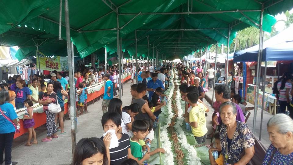 A total of 445 tables were lined-up along the main street of the town and all covered with banana leaves where the rice and viands were laid down in a stretch of 535 meters. All standing, the throng of people ate with their bare hands. Children, women, senior citizens, farmers, businessmen, barangay officials and Tanods enjoyed feast in the street.