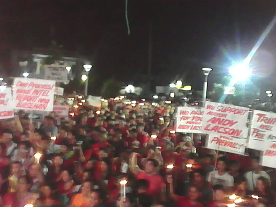 These were some among the words shouted by the town folks who filled the municipal plaza in protest of the National Police Commission’s (NAPOLCOM) order against Mayor Andy Lacson.